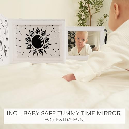 Soft Tummy Time Book w/ Stimulating Baby Safe Mirror – Fun Black and White Montessori Toy w/ Crinkle Filling & 20 High Contrast Designs – Perfect Newborn Toy For Safe and Early Infant Development