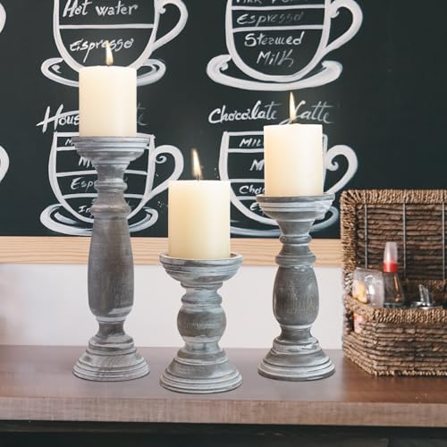 Rustic Wooden Pillar Candle Holders Set of 3, 12” 9” 6” Farmhouse Wood Candle Stand for Table Centerpieces, Vintage Tall Candleholders Fireplace Mantel Decor for Living Room, Grey